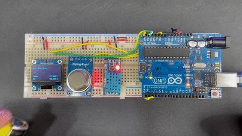 سیستم مانیتورینگ کیفیت هوای ما با استفاده از دو سنسور، پارامترهای محیطی مانند سطح گاز، دما و رطوبت را اندازه میگیرد. به طور مشخص، داده های آنالوگ سنسور گاز، که به یکی از پایه های آنالوگ آردوینو متصل شده است، داده کیفیت هوا را به ما تحویل میدهد. داده های خوانده شده از سنسور، به مقادیر آستانه ای که پیشتر تعریف شده اند، نگاشت شده و کیفیت ها را در دسته های “خوب”، “بد”، “خیلی بد” یا “سمی” طبقه بندی میکنند. به صورت همزمان یک سنسور DHT11 رطوبت و دما را اندازه گیری میکند. داده جمع آوری شده به صورت همزمان و real-time با استفاده از کتابخانه های Adafruit روی یک نمایشگر اولد نشان داده میشوند. با نظارت مداوم بر پارامترهای محیطی، سیستم خلاصه ای از وضعیت کیفیت هوا را در اختیار کاربران قرار میدهد. کاربران نیز میتوانند با استفاده از این داده ها، تغییرات محیط خود را ارزیابی کرده و متناسب با شرایط، پاسخ مناسبی از خود نشان دهند.
