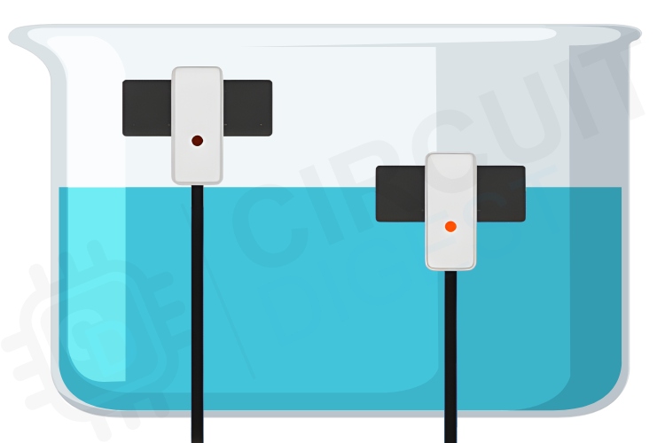 در حالت اول، وقتی سنسور مایع را تشخیص میدهد خروجی سنسور HIGH میشود. اما زمانی که پایه Mode سنسور به GND متصل است، در صورت عدم وجود مایع خروجی سنسور HIGH و در صورت وجود LOW میشود. این عملکرد سنسور را برای استفاده مستقیم از رله های مختلف بدون نیاز به میکروکنترلر ها یا برد های آردوینو مناسب میکند. در اینجا تصویر دیگری وجود دارد که همین را نشان می دهد. نشانگر روی سنسور نزدیک سطح آب روشن است و نشانگر روی سنسور دور از سطح آب خاموش است.