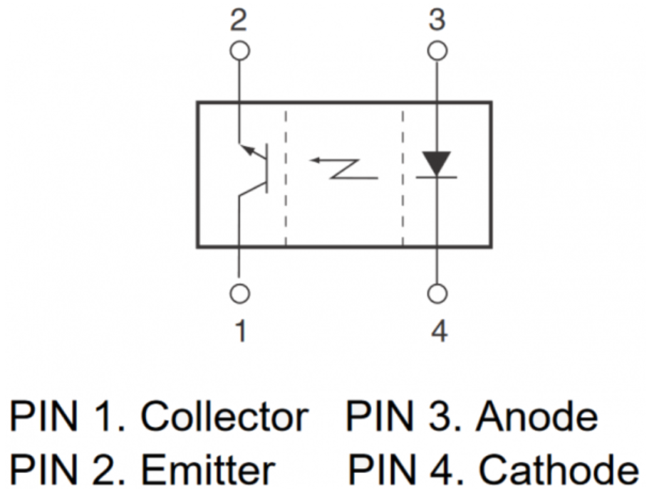 وقتی از بالا نگاه کنید، شمارهگذاری پایهها در جهت پادساعتگرد افزایش مییابد. پایه 2 که امیتر ترانزیستور است، در کنار پایه 1 و در امتداد ضلع بلند بدنه قرار دارد. پایه 3، آند LED، در سمت دیگر و در عرض پایه 2 قرار دارد. و پایه 4 که کاتد است، کنار پایه 3 و روبهروی پایه 1 قرار میگیرد.