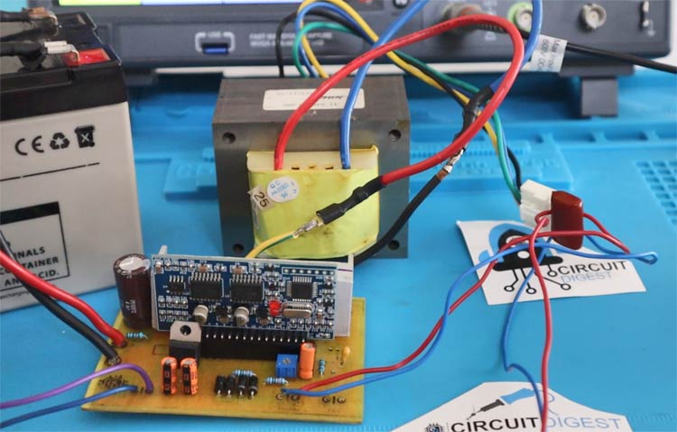 پس از اینکه مدار را با توجه به قطعات و اتصالات مناسب ساختیم، باتری را وصل کرده و سوئیچ را روشن میکنیم. اگر اینورتر پس از چند ثانیه خاموش شده و LED موجود روی ماژول EGS002 سه بار چشمک بزند، یعنی ولتاژ خروجی کالیبره نشده است. خروجی را به یک مولتی متر TrueRMS وصل کرده و تا زمانیکه ولتاژ خروجی به درستی تنظیم نشده است، به تنظیم مقاومت متغیر ادامه میدهیم.