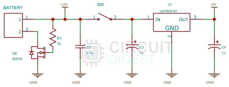 بخش تغذیه دارای ویژگی حفاظت مدار در برابر پلاریته معکوس است که مبتنی بر یک ماسفت کانال N و یک رگولاتور ولتاژ LM7805 به همراه چند خازن فیلتر ساخته شده است. ورودی باتری به ورودی تغذیه متصل شده و سپس ترمینال مثبت به طور مستقیم به یک سوئیچ پل H متصل است. ترمینال منفی هم برای حفاظت مدار در برابر پلاریته معکوس از طریق یک ماسفت کانال N متصل میشود. رگولاتور ولتاژ LM7805 ولتاژ 5 ولت لازم برای ماژول EGS002 را تولید میکند.