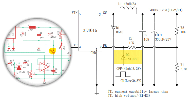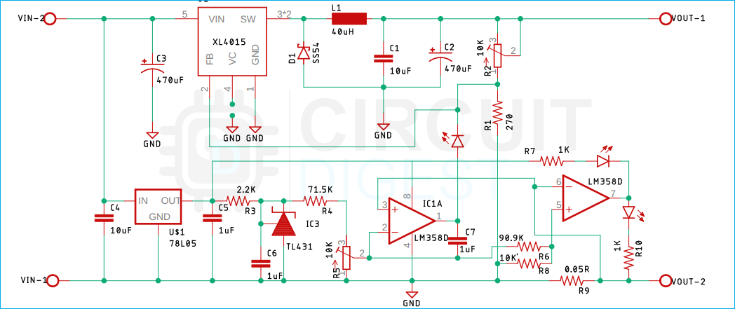 عملکرد این مدار به طور همزمان هم ساده و هم سخت است. اگر دیتاشیت ماژول مبدل باک XL4015 5A را بررسی کنیم، میتوانیم شماتیک معمولی و کاربردی این ماژول را ببینیم که در تصویر زیر نیز آورده شده است.