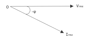 حال اگر ولتاژ عقب تر از جریان باشد، زاویه بین فازور ولتاژ و جریان منفی است و اگر فازور ولتاژ را مرجع در نظر بگیریم، داریم: