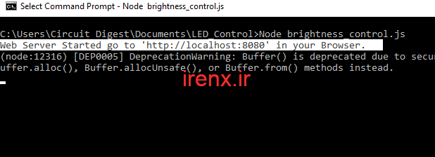 - فرمان “Node brightness_control.js” را اجرا کنید. اگر موفقیت آمیز باشد پیام “Web Server Started go to “http://localhost:8080″ in your Browser.” نمایش داده میشود مانند تصویر زیر