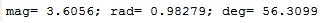 [rad,mag]=cart2pol(2,3); deg=rad*(180/pi); disp(['mag= ',num2str(mag),'; rad= ',num2str(rad),'; deg= ',num2str(deg)]);